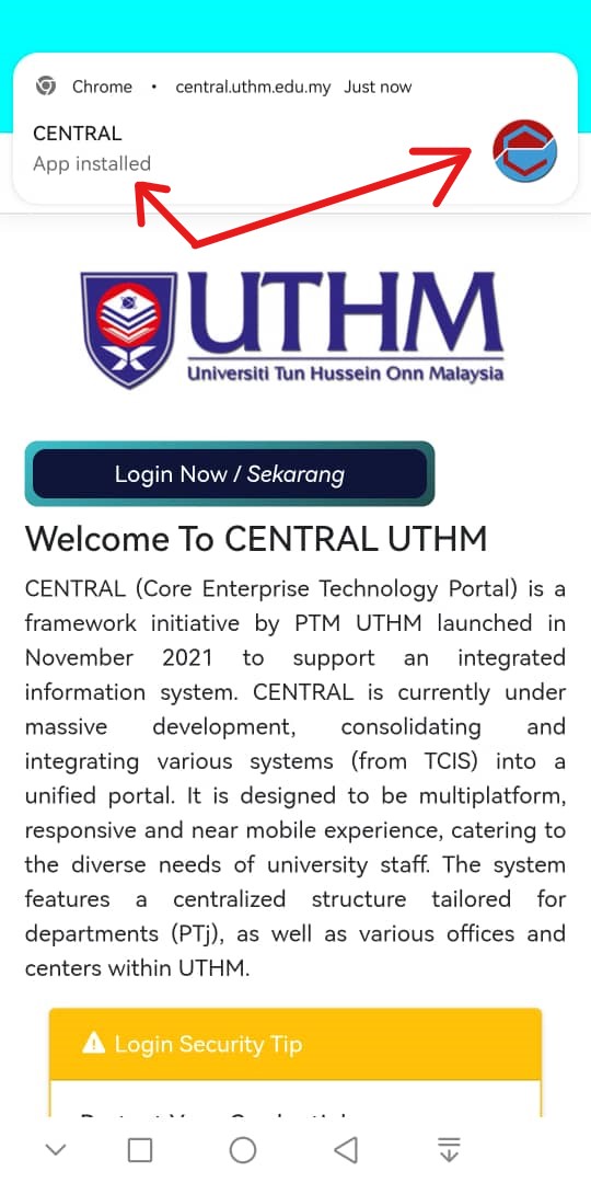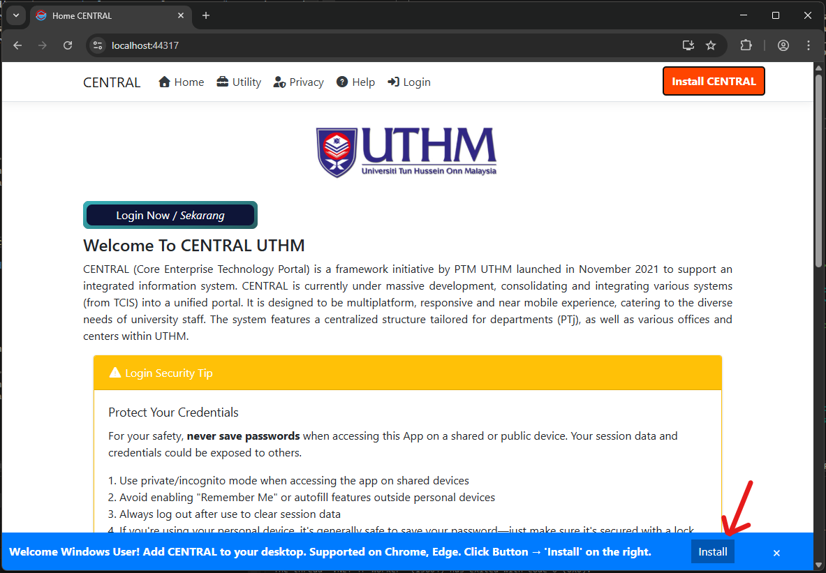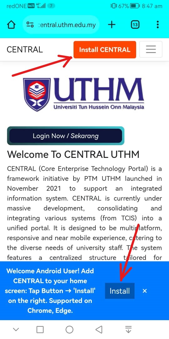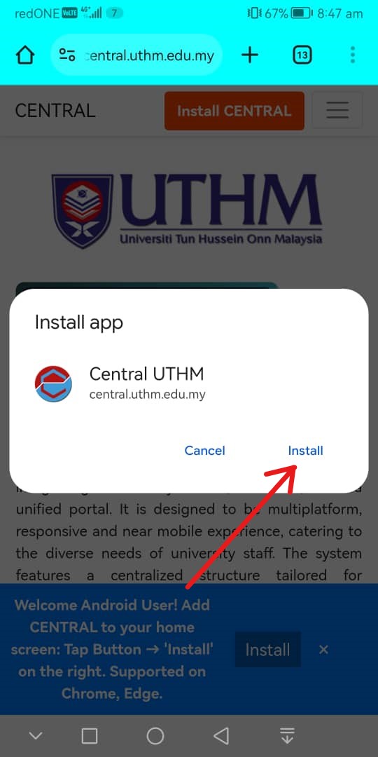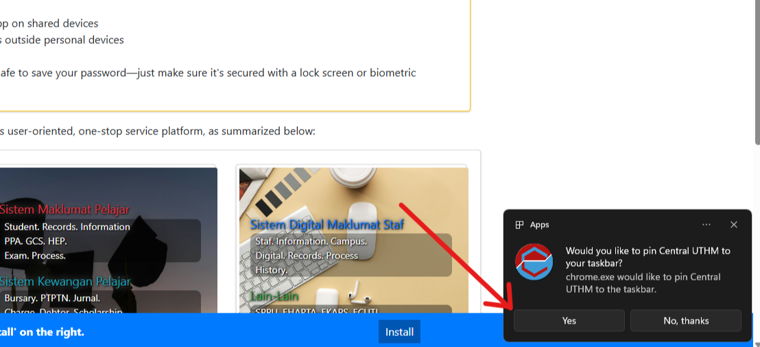 When a Pop Message appears, choose Install. Make sure it is coming from central.uthm.edu.my